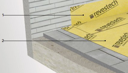 Encuentro de cubierta plana transitable, ventilada, con solado fijo, tipo convencional con paramento vertical; mediante la realización de un retranqueo perimetral de más de 5 cm con respecto al paramento vertical y de más de 20 cm de altura sobre la protección de la cubierta, relleno con mortero de cemento, industrial, M-2,5 colocado sobre la impermeabilización formada por: banda de terminación para lámina impermeabilizante flexible tipo EVAC, Dry Banda 13x30 "REVESTECH", de 127 mm de anchura, compuesta de una doble hoja de poliolefina termoplástica con acetato de vinil etileno, con ambas caras revestidas de fibras de poliéster no tejidas, de 0,52 mm de espesor y 335 g/m², fijada a la impermeabilización continua de la cubierta, con adhesivo cementoso mejorado, deformable y tixotrópico, C2 TE S1, acabado con un revestimiento de rodapiés de gres rústico, de 7 cm, 3 €/m colocados con junta abierta (separación entre 3 y 15 mm), en capa fina con adhesivo cementoso de fraguado normal, C1 sin ninguna característica adicional, color gris y rejuntados con mortero de juntas cementoso mejorado, con absorción de agua reducida y resistencia elevada a la abrasión tipo CG 2 W A, color blanco, para juntas de 2 a 15 mm, formación de ventilación perimetral de la cámara con ladrillo cerámico hueco y colocación de vierteaguas cerámico de 11x24 cm, fijado al paramento, como remate de la ventilación perimetral de la cámara. Incluso complementos de refuerzo en tratamiento de puntos singulares mediante el uso de piezas especiales para la resolución de ángulos internos y externos. | ||